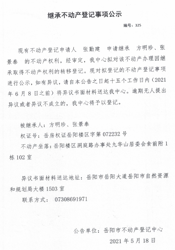 继承不动产登记公示 编号:(2021)继325(张勤建)