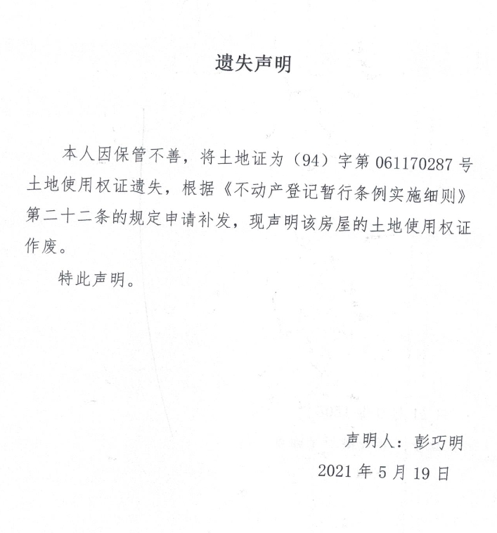 遗失声明 (彭巧明)