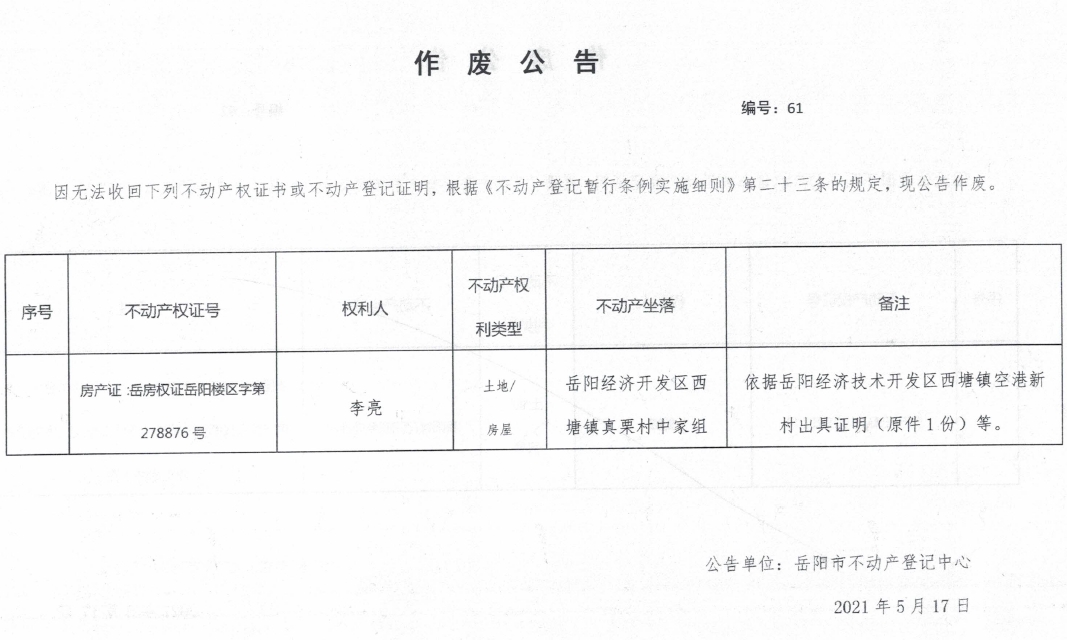 作废公告 编号:61(李亮)
