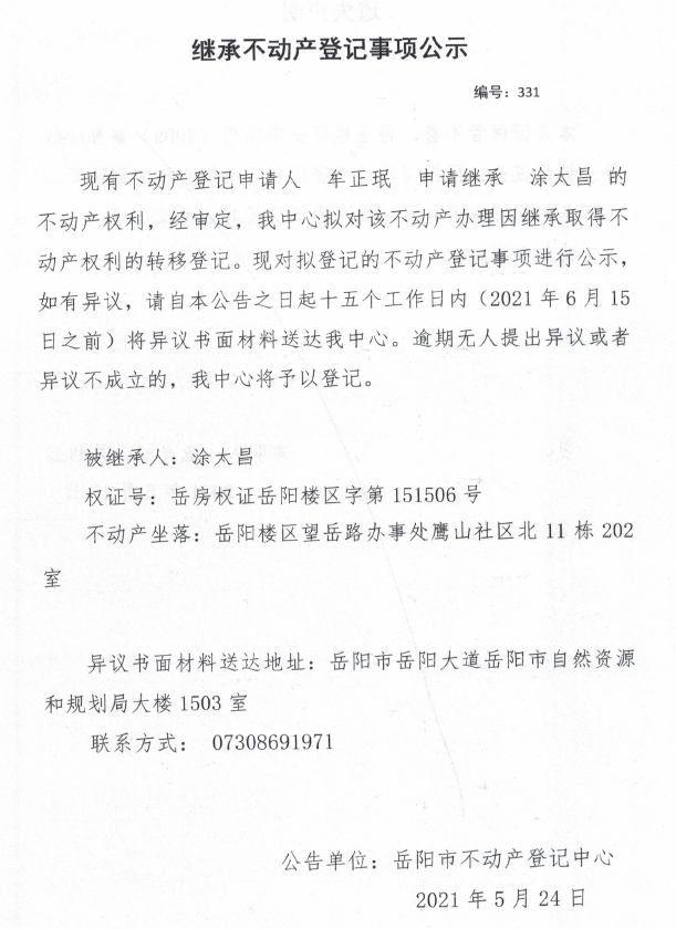 继承不动产登记公示 编号:(2021)继331(牟正珉)