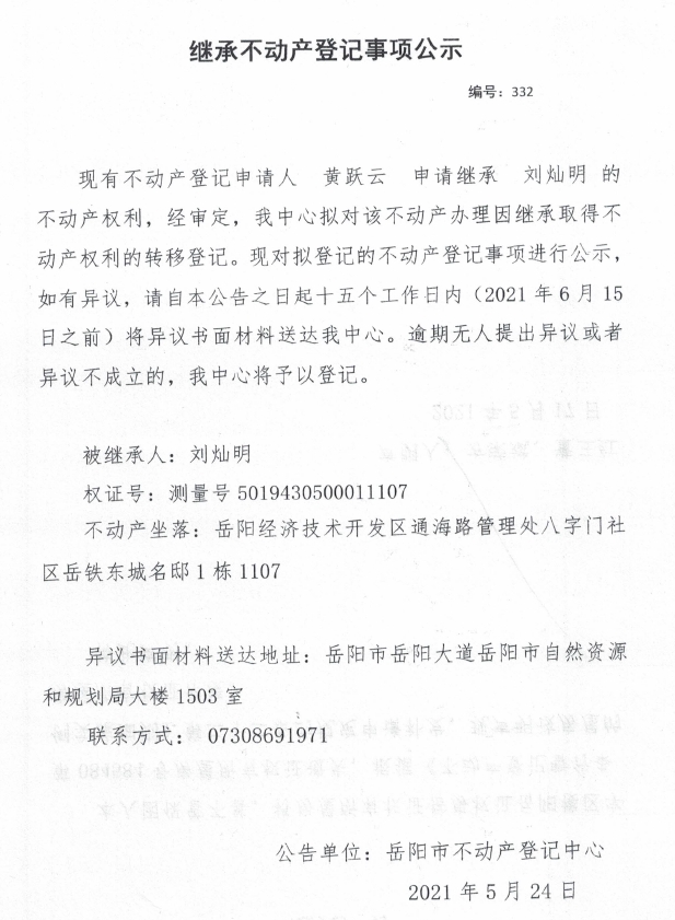 继承不动产登记公示 编号:(2021)继332(黄跃云)