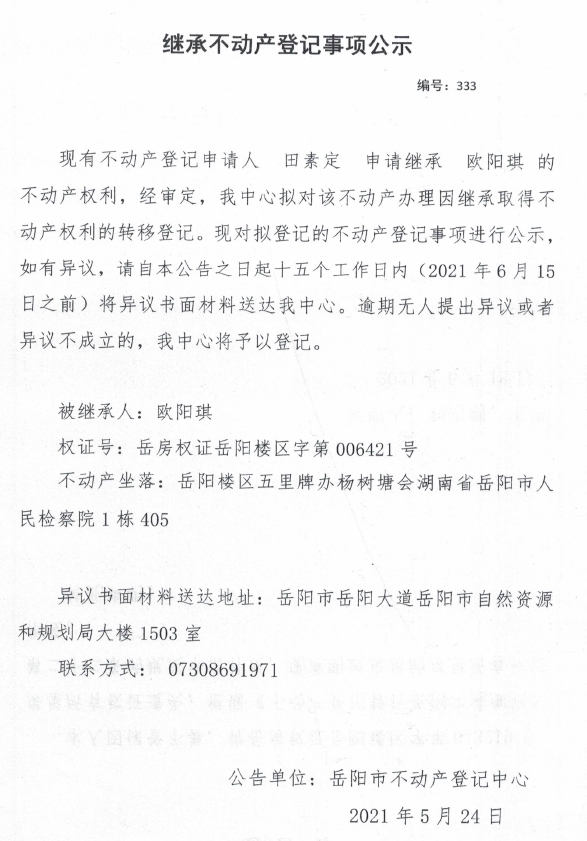继承不动产登记公示 编号:(2021)继333(田素定)