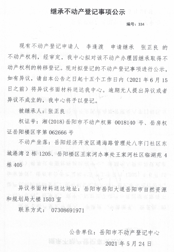 继承不动产登记公示 编号:(2021)继334(李逢渡)