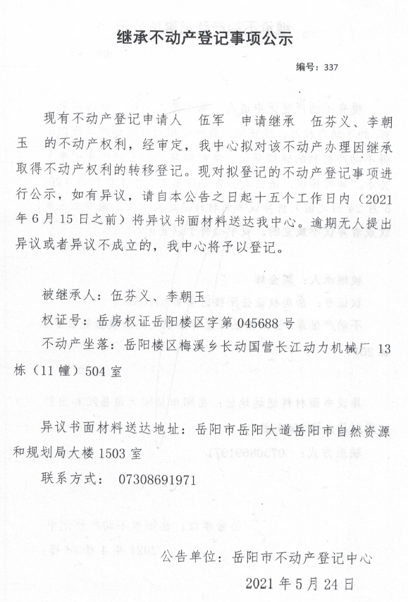 继承不动产登记公示 编号:(2021)继337(伍军)