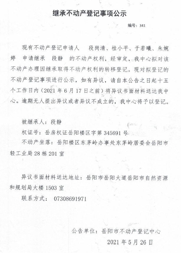 继承不动产登记公示 编号:(2021)继341(段岗清)