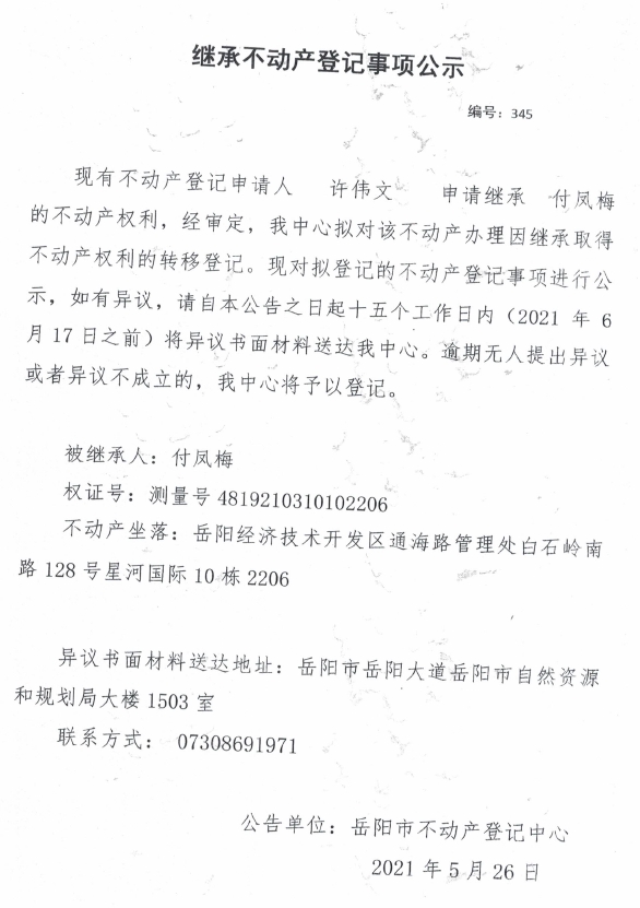 继承不动产登记公示 编号:(2021)继345(许伟文)