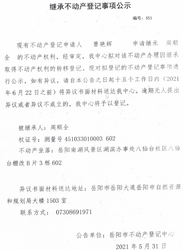 继承不动产登记公示 编号:(2021)继351(曹艳辉)