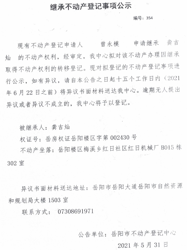 继承不动产登记公示 编号:(2021)继354(曾永模)