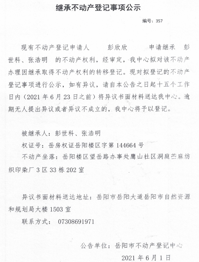 继承不动产登记公示 编号:(2021)继357(彭欣欣)