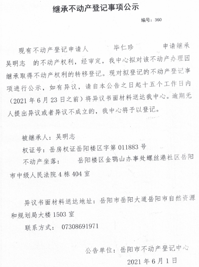继承不动产登记公示 编号:(2021)继360(毕仁珍)