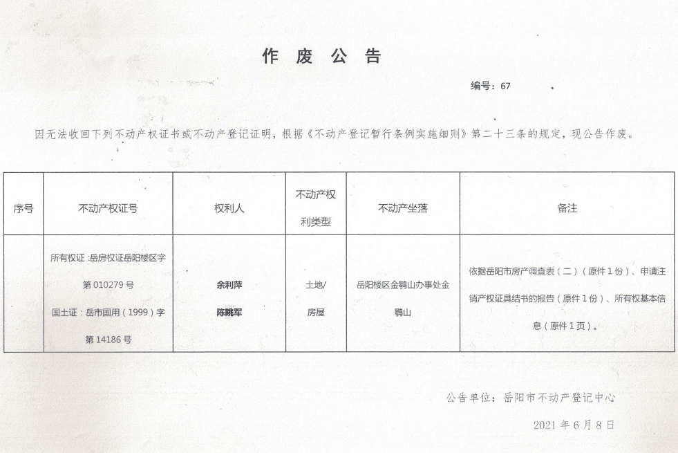 作废公告 编号:67(余利萍、陈眺军)