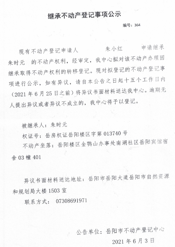 继承不动产登记公示 编号:(2021)继364(朱小红)