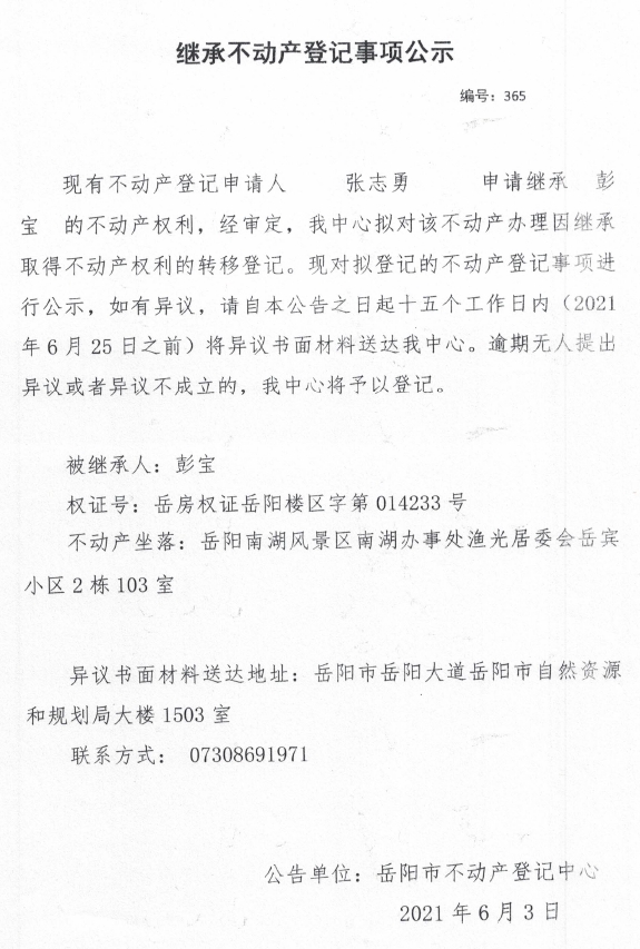 继承不动产登记公示 编号:(2021)继365(张志勇)