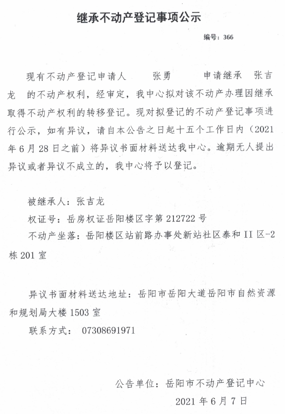 继承不动产登记公示 编号:(2021)继366(张勇)