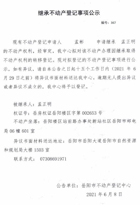继承不动产登记公示 编号:(2021)继367(孟彬)