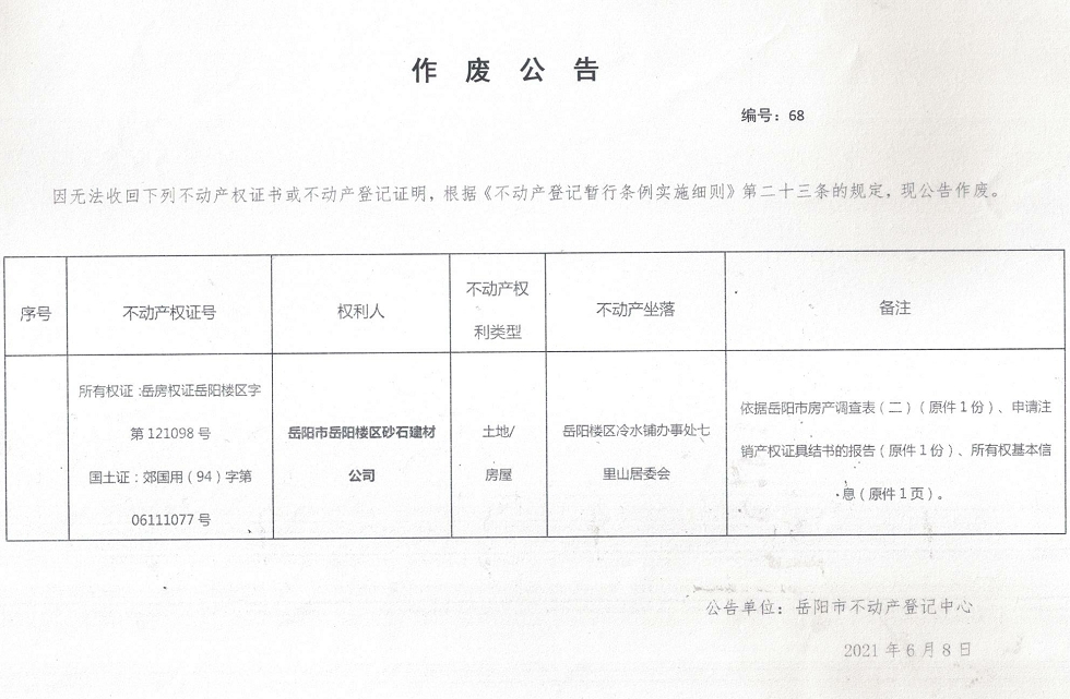 作废公告 编号:68(岳阳市岳阳楼区砂石建材公司)
