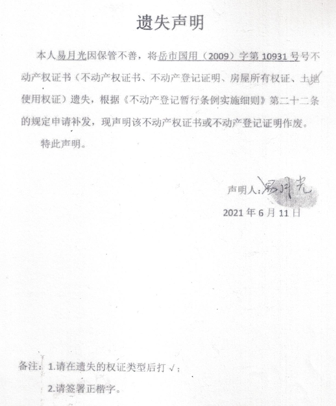 遗失声明(易月光)