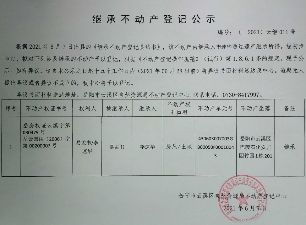 继承不动产登记公示 编号:(2021)云继011号