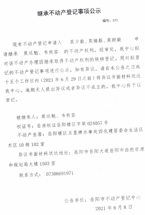 继承不动产登记公示 编号:(2021)继373(莫少毅)