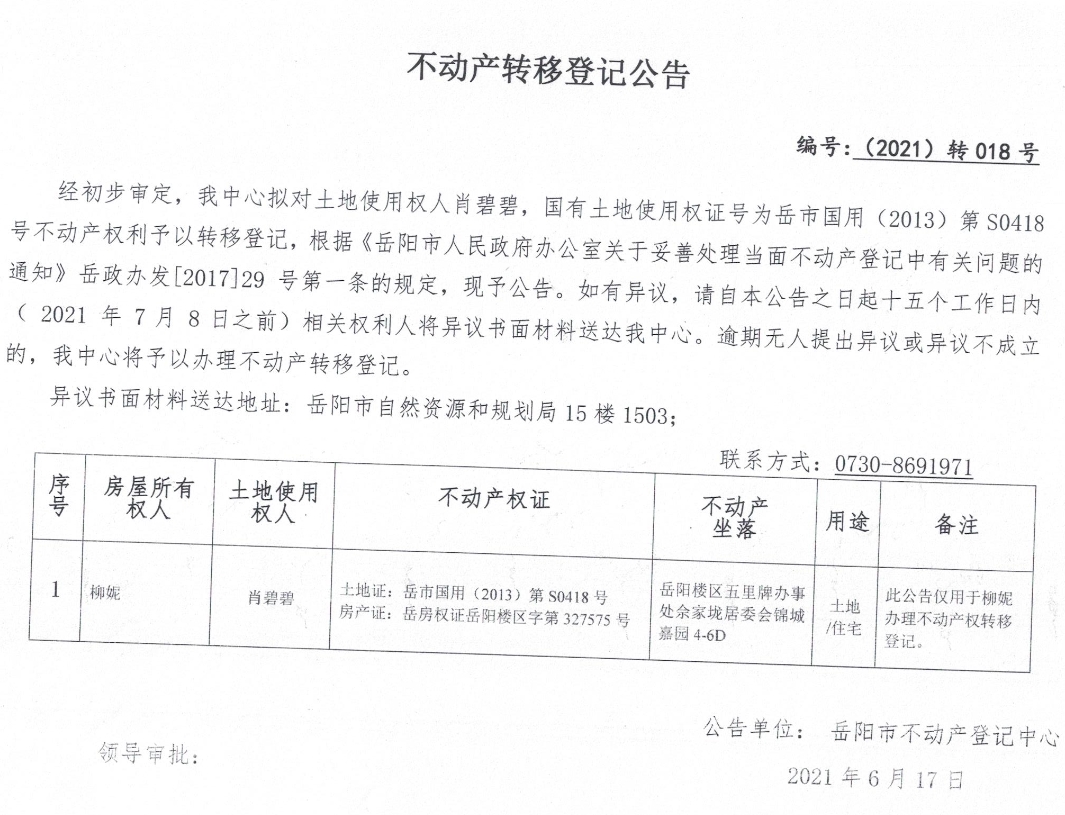不动产转移登记公告 编号:(2021)转018号(肖碧碧)