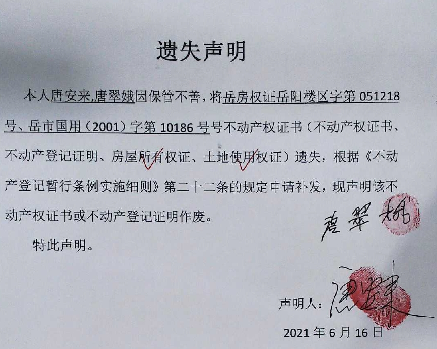 遗失声明(唐安来、唐翠娥)