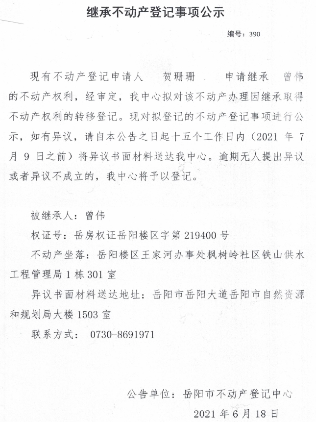 继承不动产登记公示 编号:(2021)继390(贺珊珊)