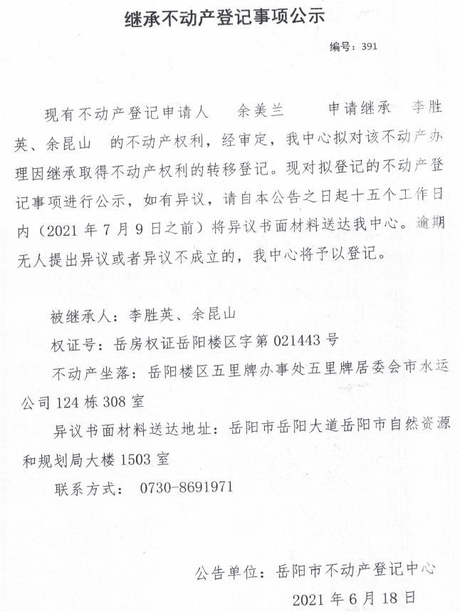 继承不动产登记公示 编号:(2021)继391(余美兰)