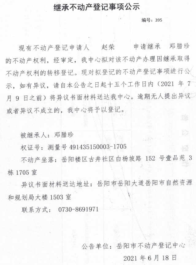 继承不动产登记公示 编号:(2021)继395(赵荣)