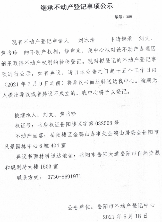 继承不动产登记公示 编号:(2021)继389(刘冰清)