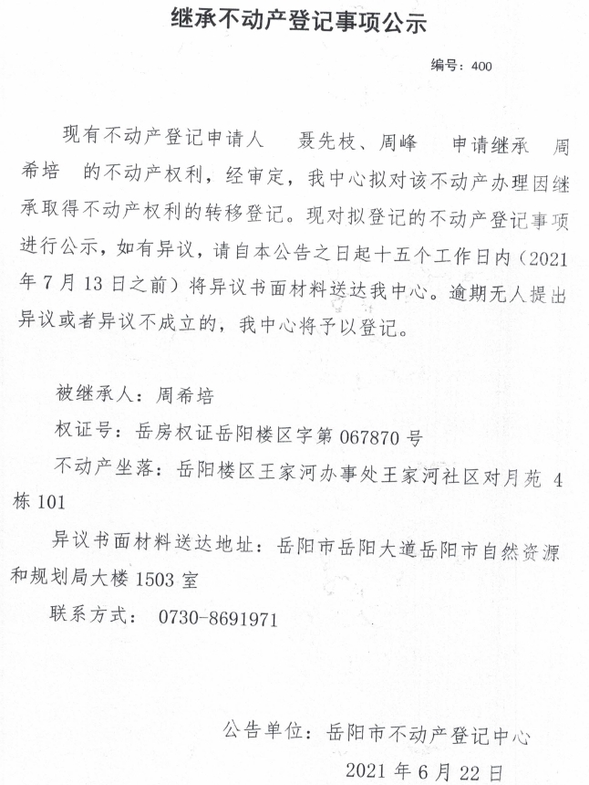 继承不动产登记公示 编号:(2021)继400(周峰)