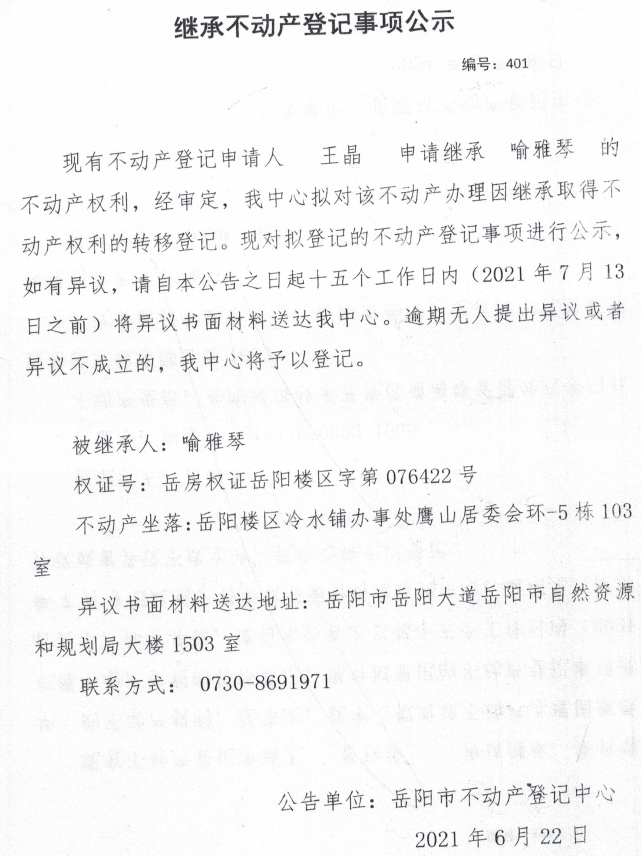 继承不动产登记公示 编号:(2021)继401(王晶)