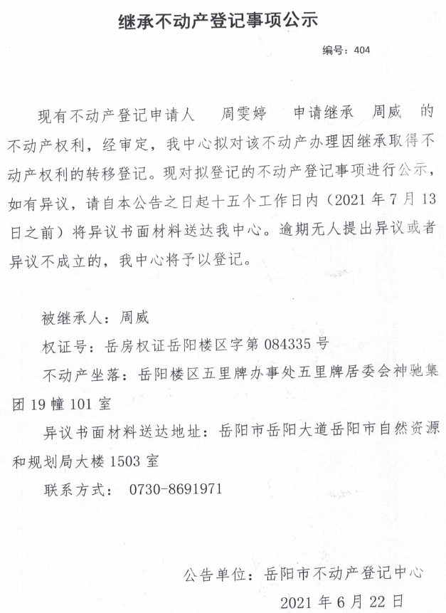 继承不动产登记公示 编号:(2021)继404(周雯婷)