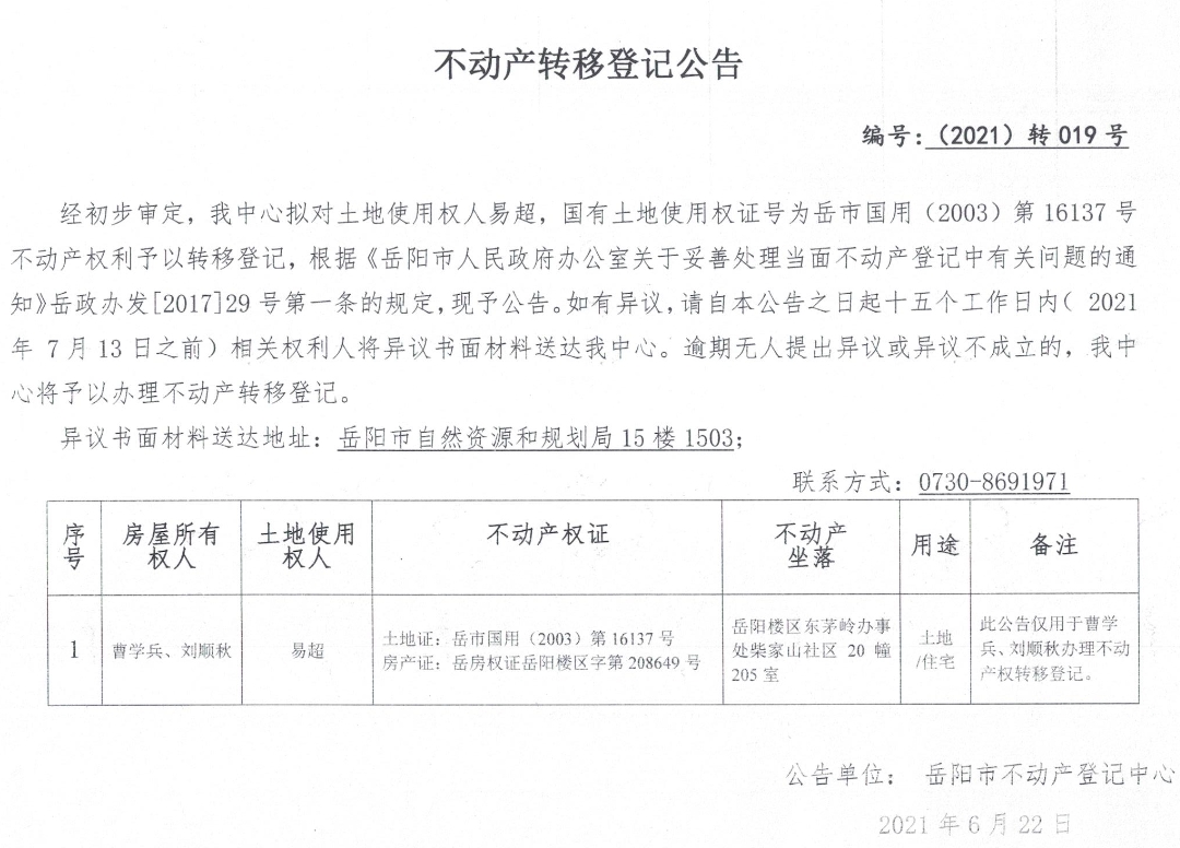 不动产转移登记公告 编号:(2021)转019号(易超)