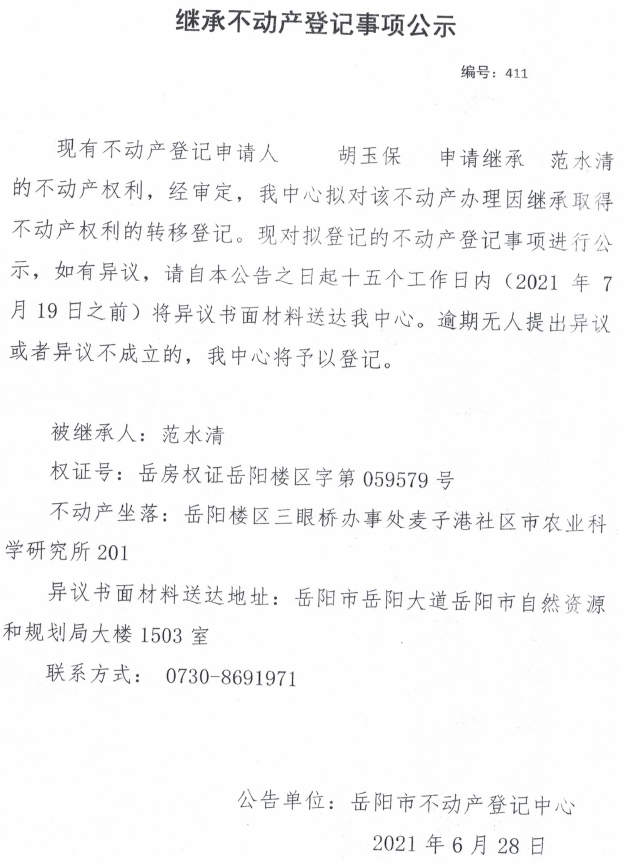 继承不动产登记公示 编号:(2021)继411(胡玉保)