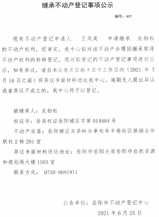 继承不动产登记公示 编号:(2021)继407(王凤英)