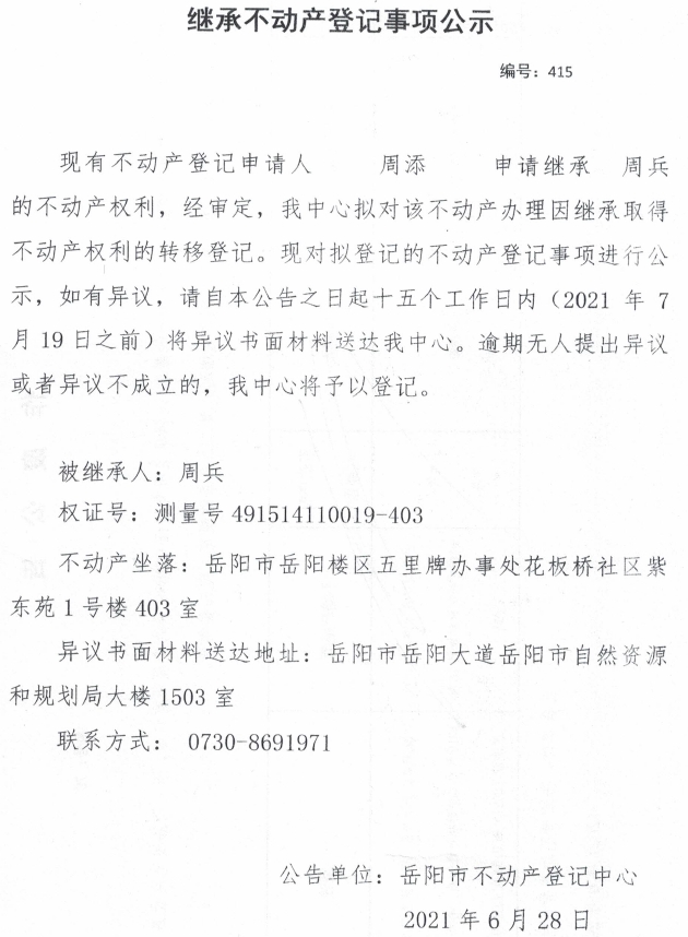 继承不动产登记公示 编号:(2021)继415(周添)