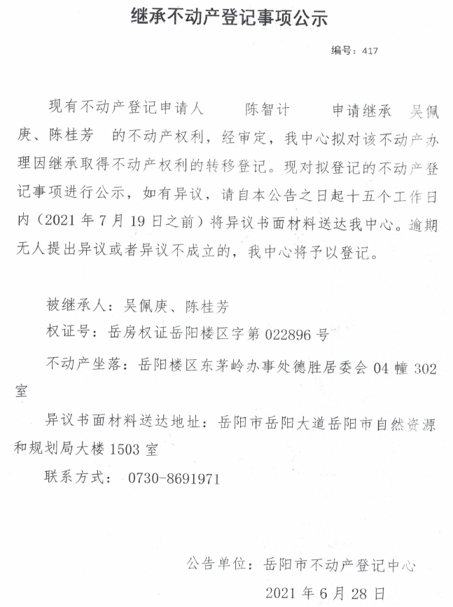 继承不动产登记公示 编号:(2021)继417(陈智计)