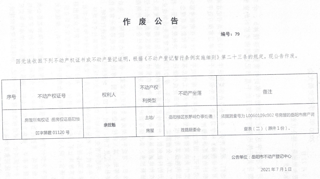 作废公告 编号:79号 (余世魁)