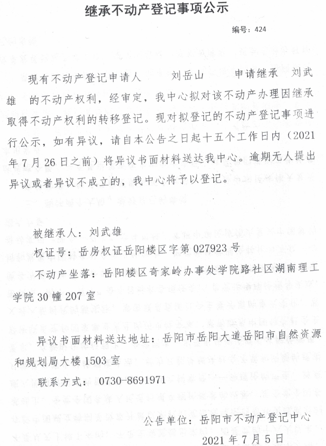 继承不动产登记公示 编号:(2021)继424(刘岳山)