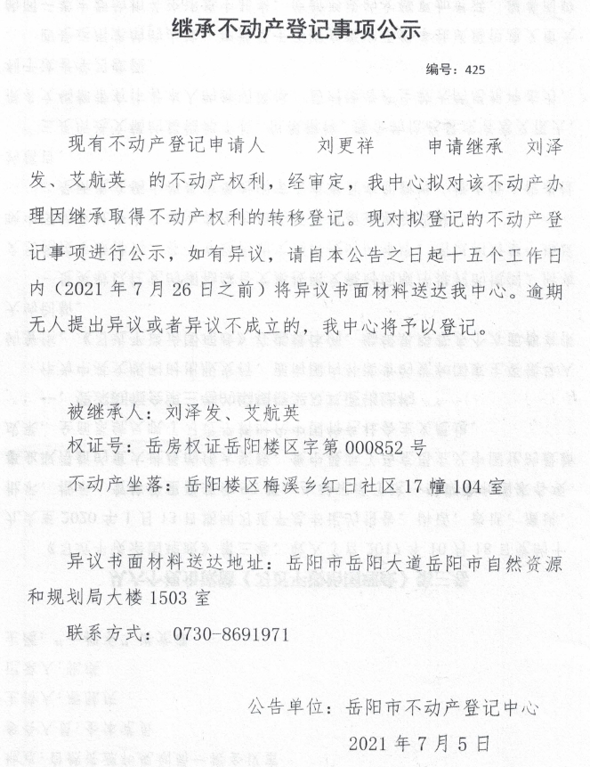 继承不动产登记公示 编号:(2021)继425(刘更祥)