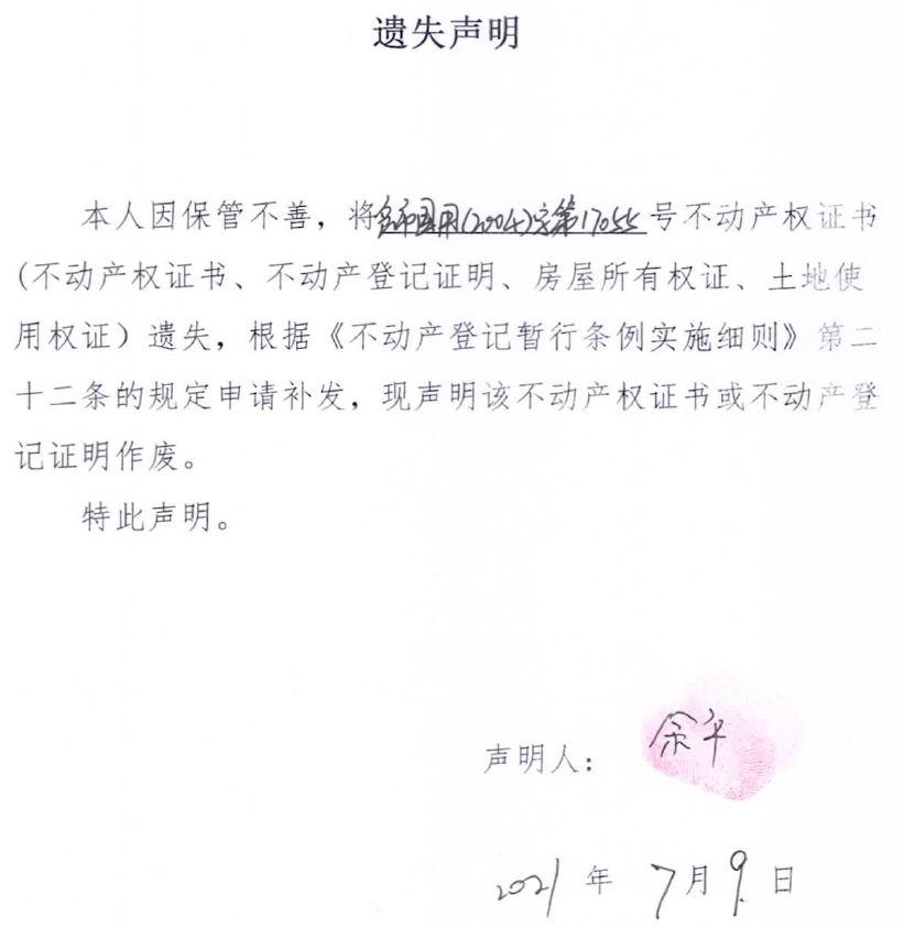 遗失声明(余平)