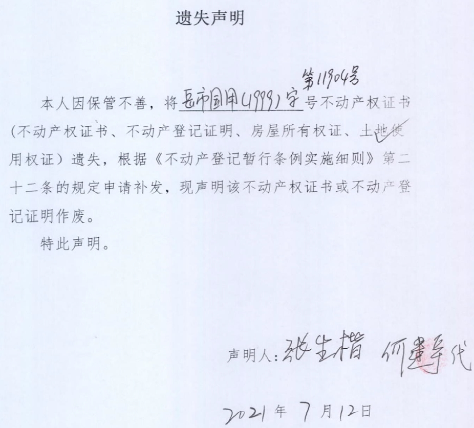 遗失声明(张一冰)