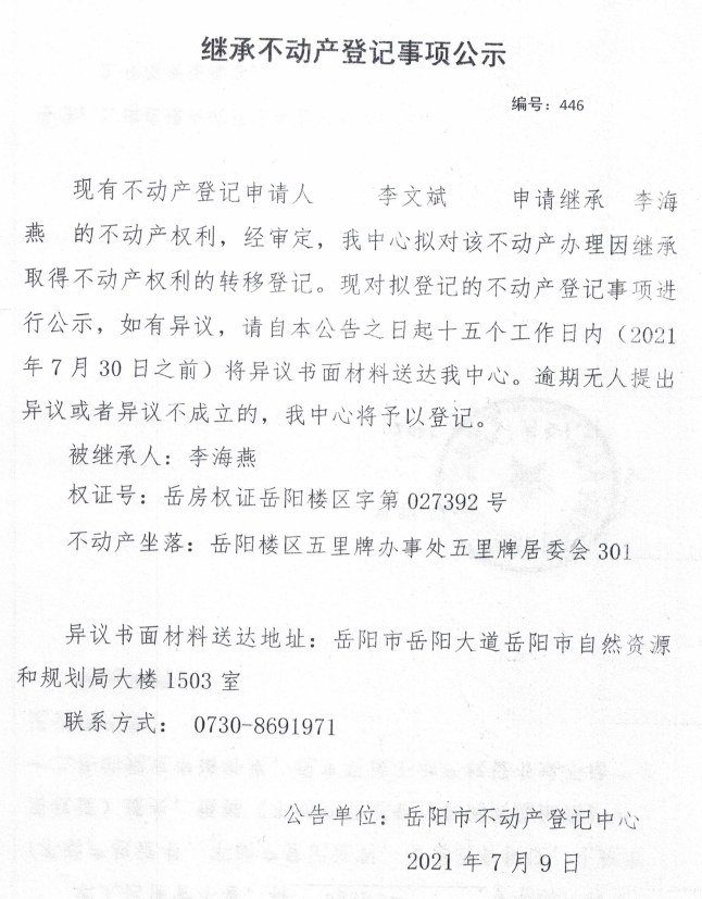 继承不动产登记公示 编号:(2021)继446(李文斌)