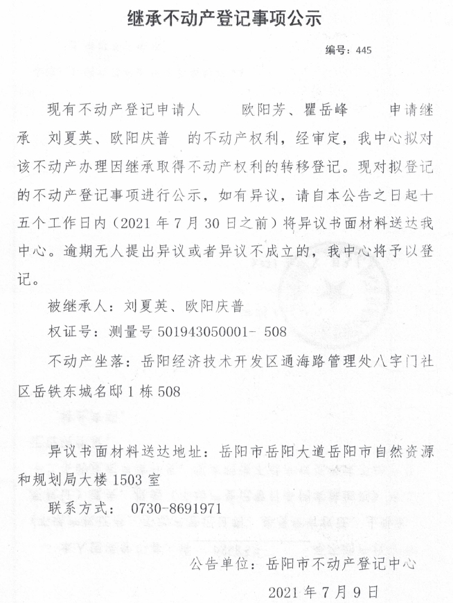 继承不动产登记公示 编号:(2021)继445(欧阳芳)