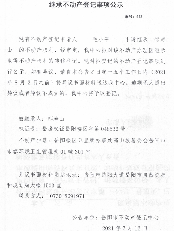 继承不动产登记公示 编号:(2021)继443(毛小平)