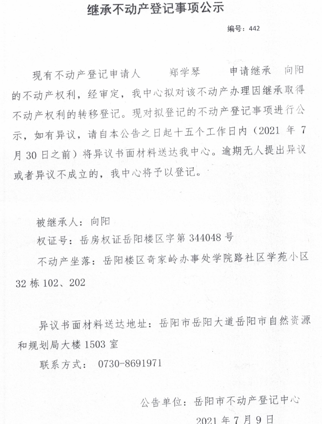 继承不动产登记公示 编号:(2021)继442(郑学琴)