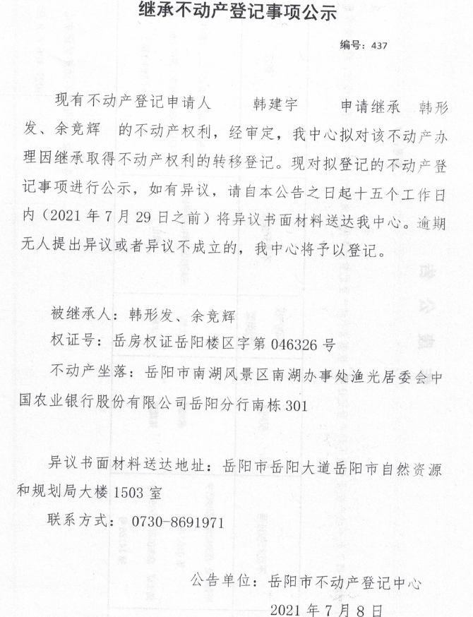 继承不动产登记公示 编号:(2021)继437(韩建宇)