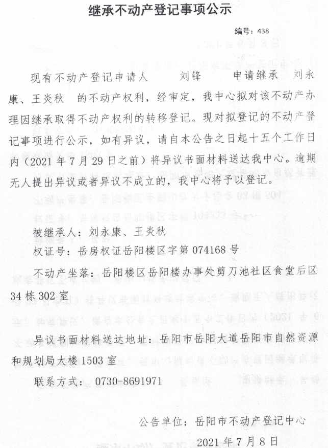 继承不动产登记公示 编号:(2021)继438(刘锋)