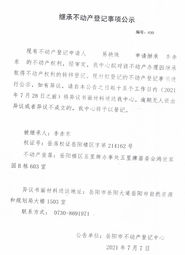 继承不动产登记公示 编号:(2021)继430(易艳珠)