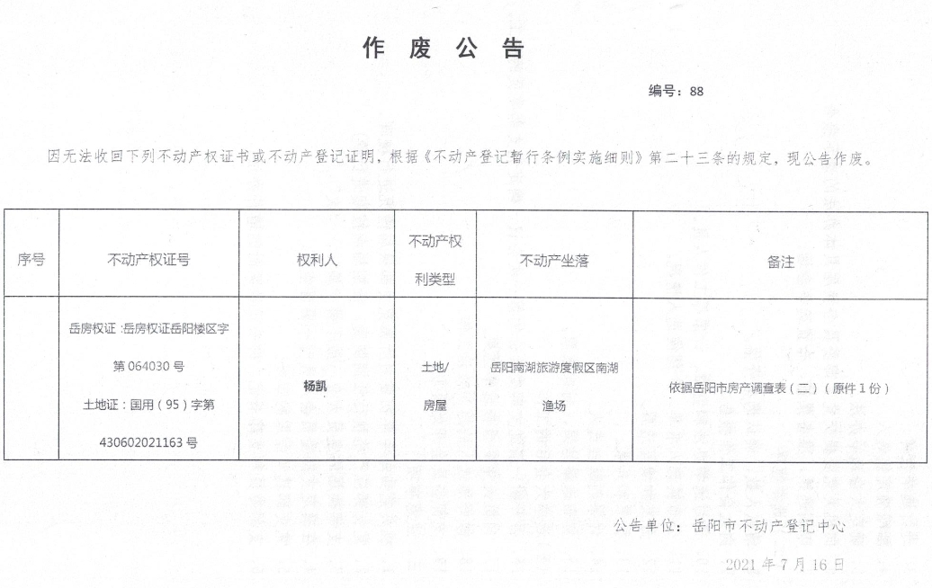 作废公告 编号88(杨凯)